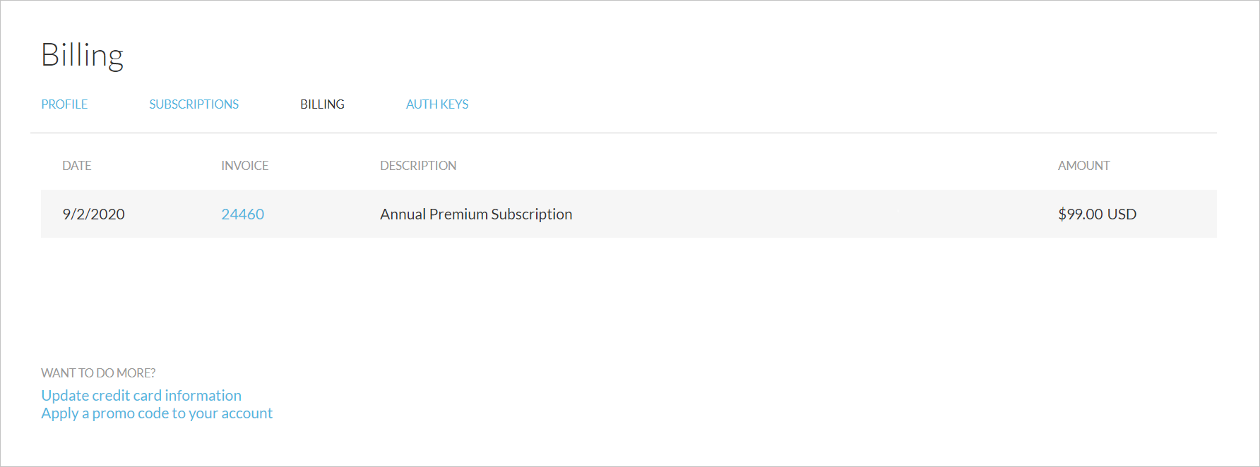 Aside from viewing your past invoices, you can also visit your billing page to update your credit card or apply a promo code to your account in advance before a purchase or renewal (this is not usually needed since you are given an opportunity to enter a promo code at the time of first purchase).Additional Help