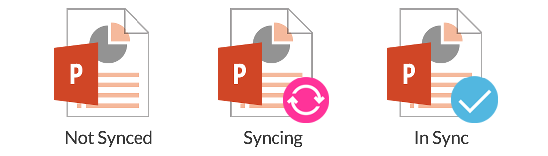 Files have real-time badges indicating their sync status. Pink means it is synchronizing, and blue means it is in sync. If there are no badges, the file is waiting to sync.