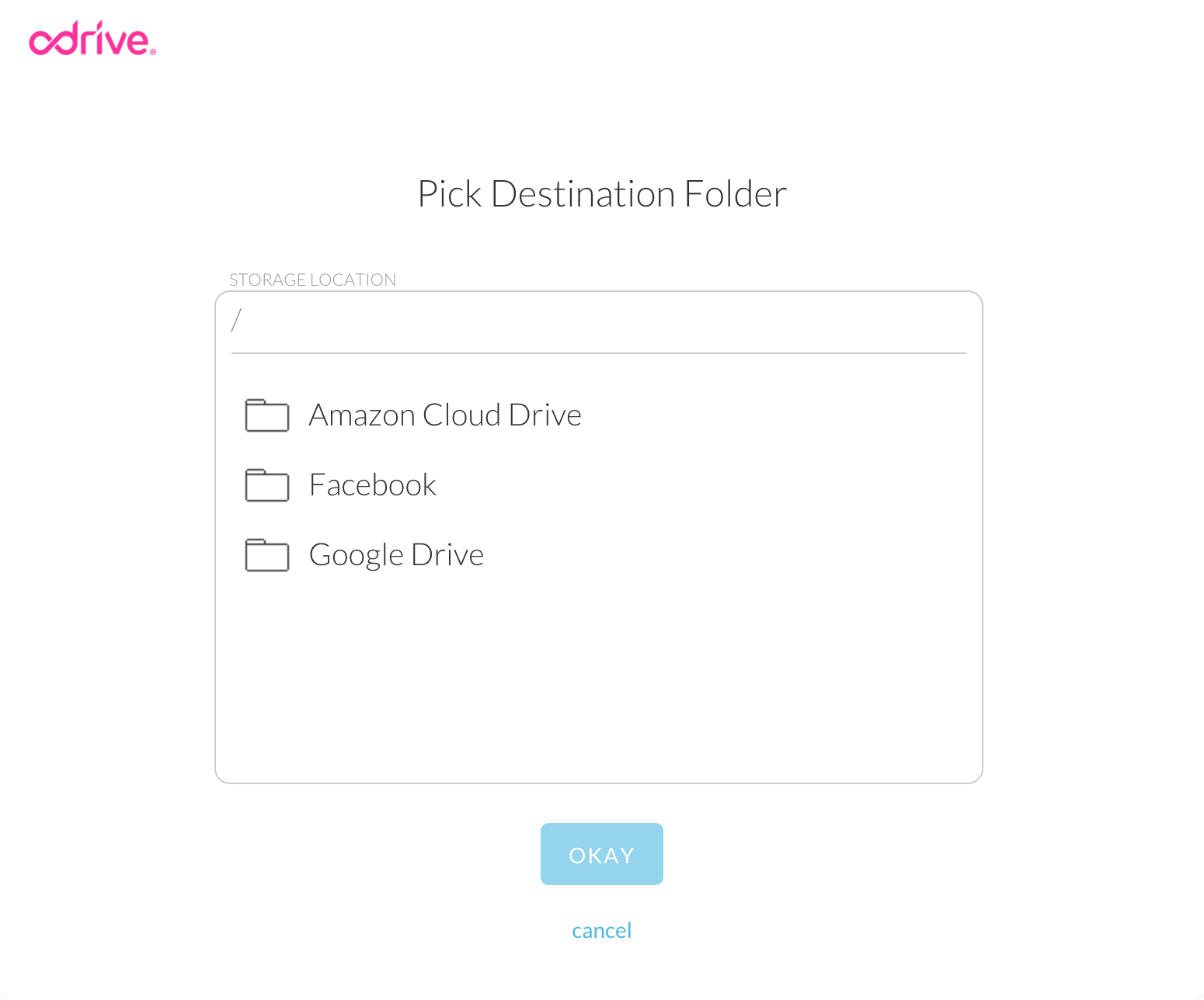 2. Select the storage location in odrive. If the destination is not empty, the remote and local content will be merged.